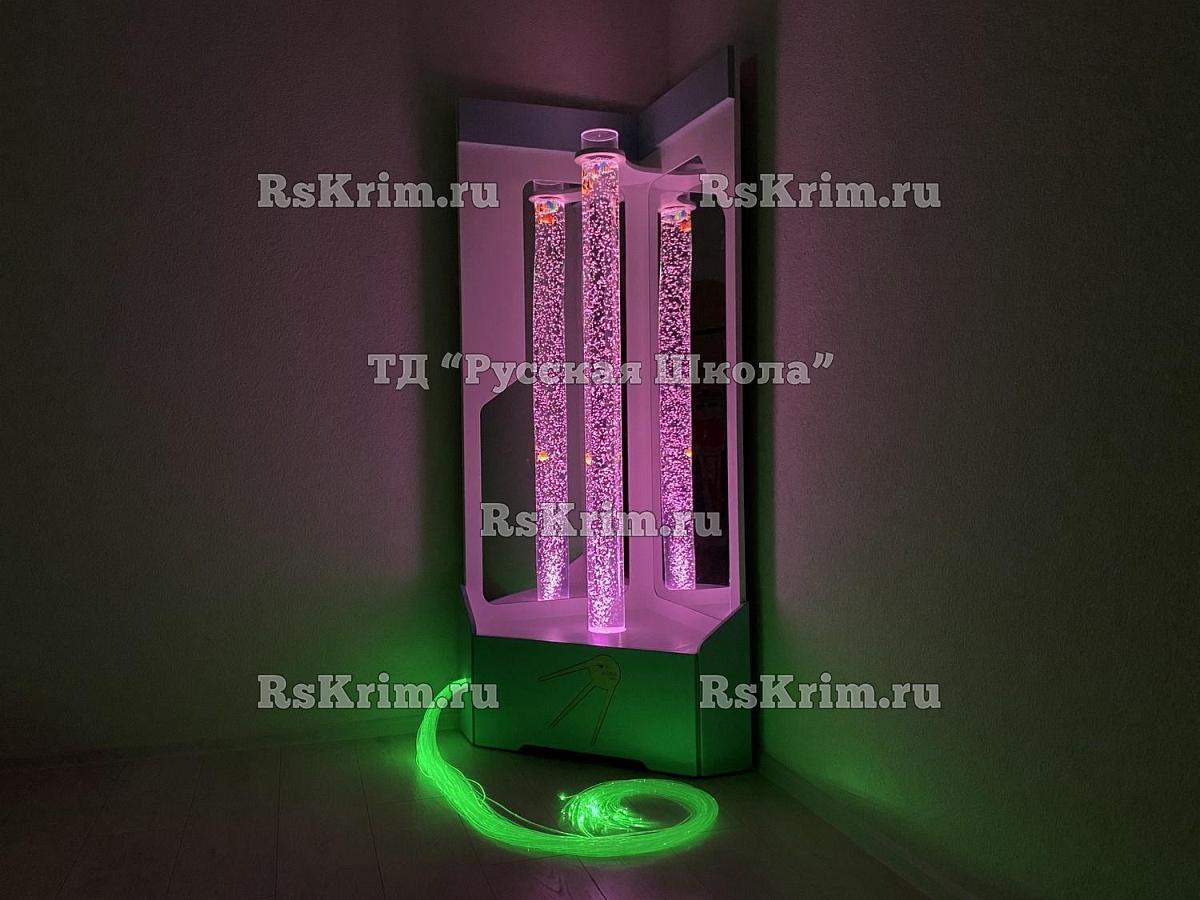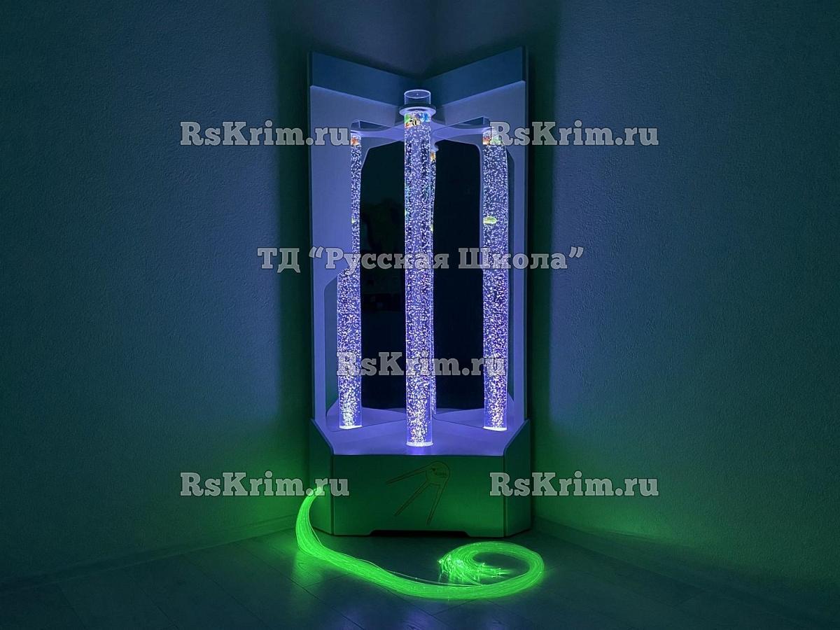 Угловая конструкция состоит из жёсткого основания, внутрь которого спрятан компрессор, подающий сжатый воздух, и открытой части с высоким воздушно-пузырьковым цилиндром и фонтаном из фибероптического волокна. Основание выполнено из экологичного МДФ и покрыто плёнкой ПВХ, устойчивой к повышенной влажности и ультрафиолетовым лучам. Такое покрытие не боится сколов, царапин, не выгорает на солнце и абсолютно безопасно для детей.