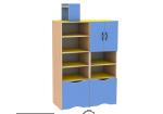В двух цветовых сочетаниях: стойки бук-натур, фасады светло-синие, полки желтые ИЛИ стойки бук-натур, фасады манго, полки салатовые